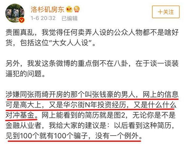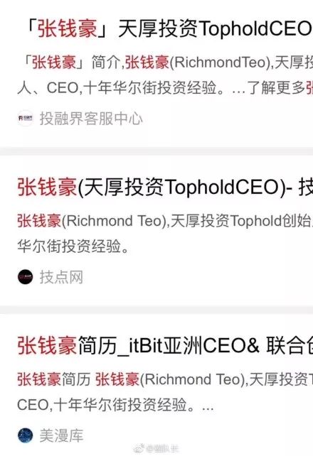 5 a8 O( R# L. q- ?6 ^" W这位张钱豪先生的标签是天厚投资Tophold创始人、CEO,有十年华尔街投资经验。但有人说这张钱豪根本就没有表面上那么牛皮,其实就是个骗子。