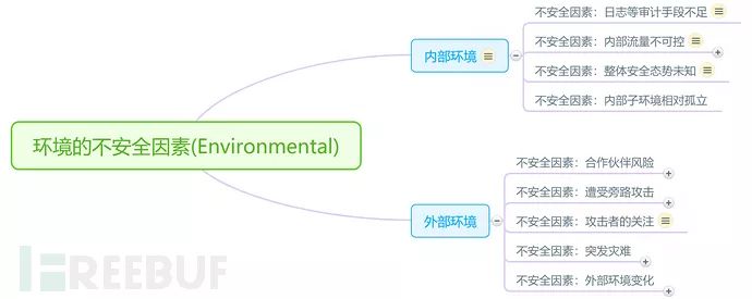 外部环境中不安全因素的识别,主要是站在旁观者的视角,来观察企业,或者企业想知道自己的安全状态从攻击者来看是什么水平或状态。例如外部合作同伴(如供应商倒闭)带来的风险,对体系或业务体系进行的旁路攻击,突发灾难等。内部环境的中的不安全因素主要是管理者从企业日常建设或安全事件中总结出来的内部整体安全氛围的情况。如在安全事件溯源过程中发现的日志审计手段不足,在攻击发现过程中对现对流量的不可见性,甚至于对内部整体安全态势的盲目乐观等。示例如图: