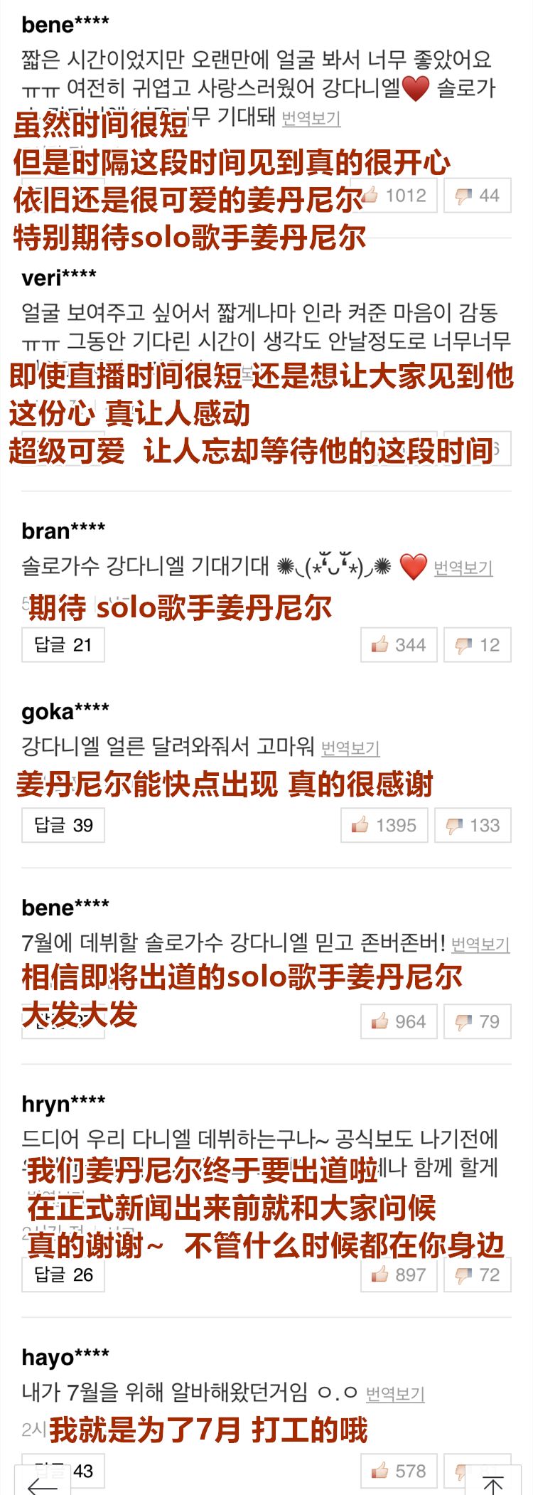 直播中姜丹尼尔表示:“音乐制作正在进行中,我也参与了作词和作曲,该怎样带给大家更好的音乐和信息,其实苦恼了很久。准备了很多很棒的Contents内容,请多多期待~我最辛苦的时期大家给予了我很大的力量,我现在也会努力成为能给大家带来力量的丹尼尔~让大家等待了太久对不起,现在我会努力的奔向大家的~不久之后见~”。 % `5 U8 k; x6 F