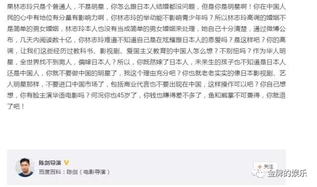 当然林志玲嫁给谁那是她的自由,别人是没有办法干涉的。但是陈剑导演的话倒也不是一点道理也没有,毕竟林志玲在内地的影响力巨大,知名度极高,嫁到日本后还要改日本人的名字,那么以后来内地捞金,那就就是在变相的养日本人吗?" W7 f [6 L" i