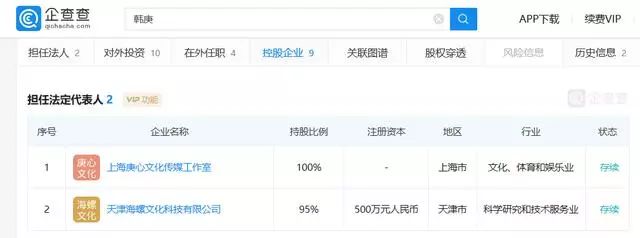 韩庚是Super Junior的前成员,是第一位在韩国出道的中国艺人。2008年韩庚担任其子组合SJ-M的队长,2009年12月21日与韩国SM娱乐有限公司解约并宣布单飞,虽然与韩国SM公司解约回国发展后,韩庚有过一段沉寂期,但是他的粉丝基数依旧庞大,在电影《前任3》大卖之后,韩庚的事业也重新走向高峰,企查查显示,目前韩庚在两家公司担任法人。