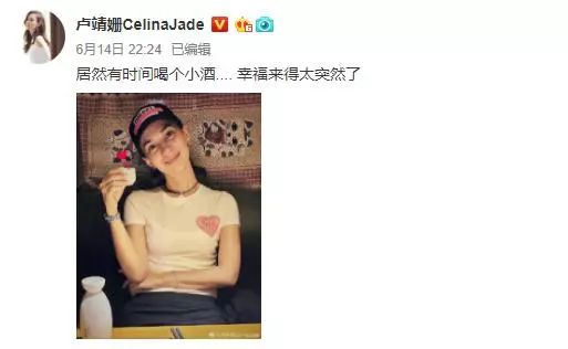 6月14日晚,韩庚的女友卢靖姗在自己的社交软件上晒出了自己的一张美照,配文:“居然有时间喝个小酒…… 幸福来得太突然了”