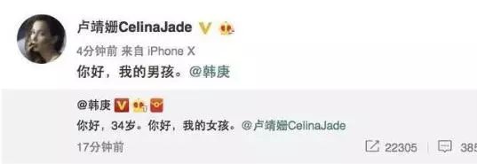 去年在韩庚的34岁生日当天他们二人在微博公开了恋情,女方表示:“你好,我的男孩 @韩庚”而男方随即留言:“你好、34岁、你好、我的女孩,@卢靖姗CelinaJade”。这在娱乐圈引起了不小的轰动效果,虽然大部分粉丝感到十分惊讶,却还是选择祝福自己的偶像,但是后来这对娱乐圈情侣几乎就没有秀过恩爱,算起来他们的恋情也持续一年多了。
