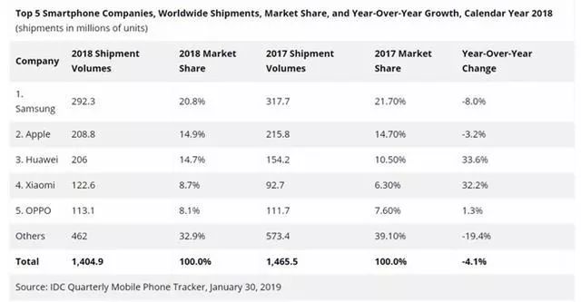 从市场份额上看,2018年三星、苹果、华为三强争霸的格局依旧没有改变,但对风云变化的2019年来说,这一排名有望被刷新。