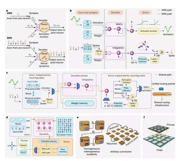 另一方面,ANN和SNN神经元之间也存在一些相似之处,这就为模型间的融合留下了空间。通过对ANN和SNN的神经网络模型进行详细比较,将计算模型解析并对应到相关的神经元功能模块上 - 即轴突、突触、树突和胞体,从而构建一个跨范式的统一神经元方案(如图4c所示)。团队设计了同时适用两种方案的突触和树突,而轴突和体细胞通过独立重构来改变功能。  1 {/ g8 }( z2 k$ }: |7 g2 U