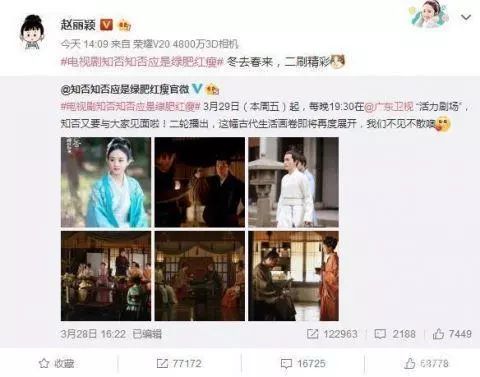 这是赵丽颖产后21天首次更博,为自己跟老公的夫妻档作品继续宣传,博文中晒出的六张照片都是剧照,颖宝端庄美丽,二叔英勇帅气,两人剧里剧外一样甜蜜,在颖宝更博不久,冯绍峰也紧跟着更博,两人说的话意思一样,在粉丝眼中这是暗戳戳“撒糖”呢!9 n$ j& g6 @, l/ j& t