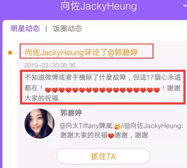 . `- q; J F9 M5 N4 p0 r% w而且向佐还在郭碧婷的微博下评论了17颗心。当时有粉丝为大家答疑17颗心的含义“17颗心代表在一起,也有10月17日一起招商活动,1月17日台北牵手照,3月17日定婚。”" D0 W% f7 g0 u9 {