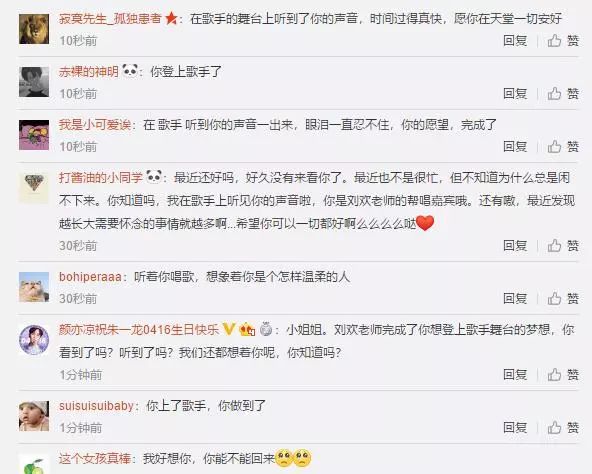 1 `% O9 j& o" l! ~0 o一曲唱罢,刘欢含着眼泪,用颤抖的声音说:感谢编曲,也谢谢“歌手”姚贝娜!不到最后我不敢讲,我有一个期许,今天实现了,我把她带到了《歌手》最后的舞台上,她一直想来《歌手》!的确,姚贝娜曾说过:最遗憾的就是没有上过《歌手》的舞台,而如今刘欢总决赛算是和她一起完成这首歌,圆了她的一个梦。一个已世歌手可能很多人都已经淡忘,但是其几年前的一个小愿望,刘欢却能一直记在心里。作为前辈,刘欢真的是可敬!