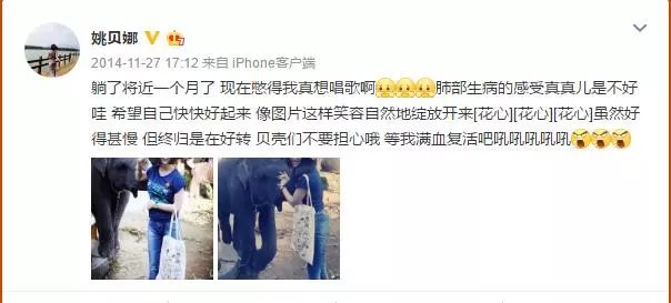 在刘欢结束之后,来到姚贝娜本人的微博,最后更新的一条还停留在2014年11月27日,姚贝娜晒出的照片脸上还笑得那么开心。 Q% Q7 E6 K% X- U