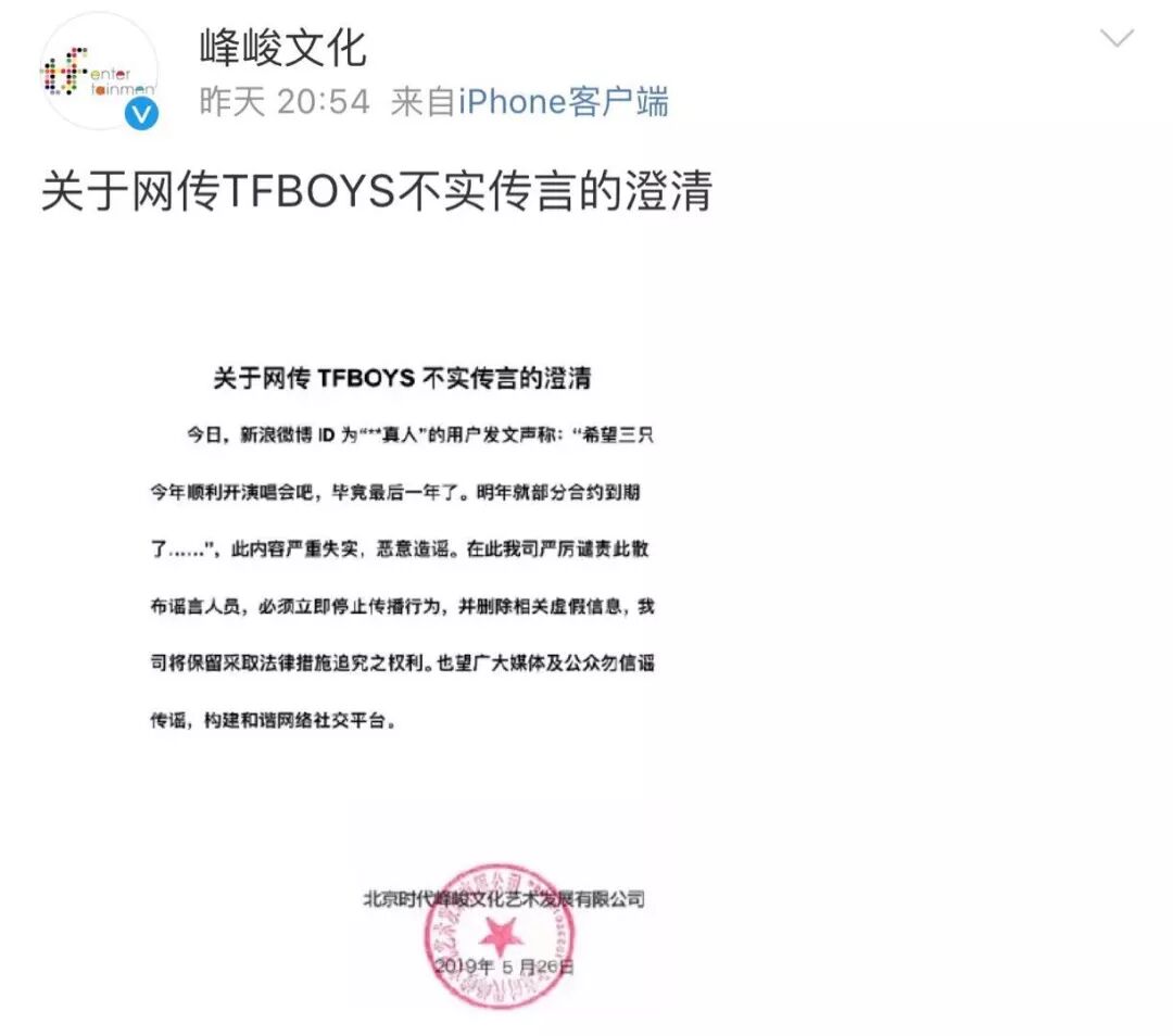 针对网上流传的“TFBOYS明年就部分合约到期……”引发的网友讨论TFBOYS组合是否将解散的传闻,经纪公司时代峰峻回应:“此内容严重失实,恶意造谣。”& L" J' Z/ d4 N$ o6 C