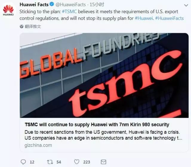 + J; ~6 n4 k, z美商务部把华为列入出口管制“实体名单”,造成恶劣影响波及美国企业和市场,部分台湾电信运营商跟也着“放枪”。总部位于台湾新竹市的台积电是全球最大的芯片代工制造厂,被视为华为“生存战关键一环”。5月22日,华为在官方推特上证实:台积电不会停止供货。