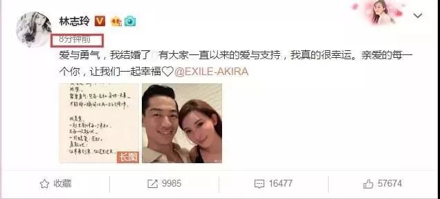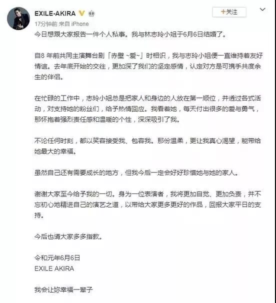 (图为AKIRA公布婚讯的微博截图) - g9 e7 p9 A4 L3 A" f6 u, H }