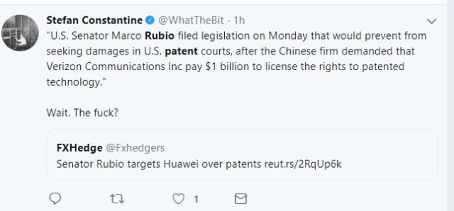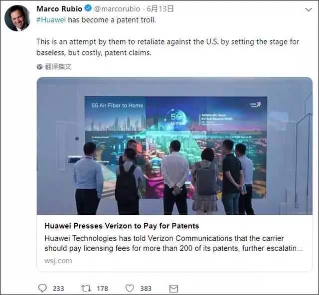 在该消息被爆出的第二天,一直以反华立场作为自己政治"卖点"的美国"知名"议员马尔科·卢比奥(Marco Rubio)在自己的推特上喷华为"专利流氓":华为的专利是"毫无根据但价格高昂的"。