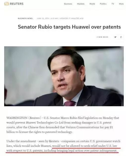 ' i( O! P+ G" F" V同样是路透社的一篇报道“Senator Rubio targets Huawei over patents”中指出,6月17日,作为对美国国防授权法案(National Defense Authorization Act, or NDAA)的修正意见中,卢比奥提议修改美国国防授权法,禁止中国华为公司通过美国法院向美国企业索要专利费、寻求损害赔偿。