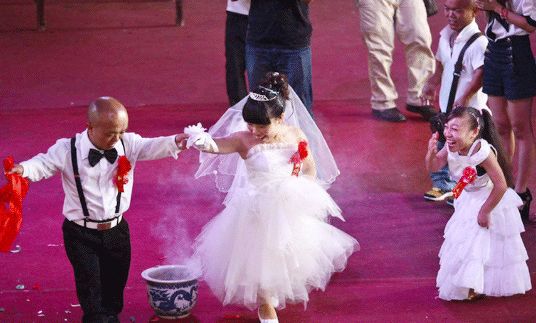 2 [: P0 i* b* f& b婚礼上,一对新人拜完堂后跨火盆。7 t$ ?3 S! n w