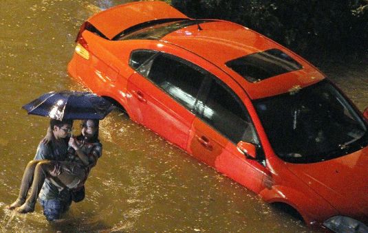 - ~- w7 c& ?; s暴雨袭城,水淹到人的膝盖。