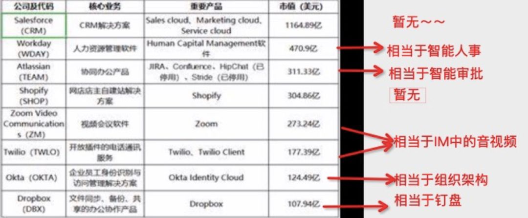 # T# t3 u3 d9 G( x我们能不能简单的说,钉钉就一定是一家千亿美金的超级独角兽呢?直接数据不支持这么说,但我们可以看到,钉钉提供的服务其实远远超过了美国Top10的SaaS企业所提供的范围,即使它暂时还没有CRM服务,不好对标Salesforce,但是仅仅它提供的智能人事、智能审批、组织架构、钉盘等一些功能,在美国其实都有对标企业如Workday等,Atlassian等,它们的市值都在数百亿美金,至少也超过了100亿美金。