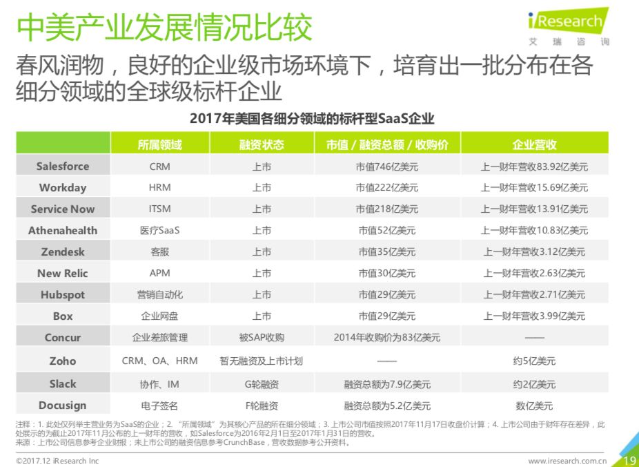 - r) K" M& o8 C! ?5 d国内最常见的一种估值方法是看美国的对标企业。在这个领域,笔者手里有两个统计数据,一个是2017年美国各个领域标杆SaaS企业的排名;另一个是选取更广泛的企业服务+协同办公的领头羊企业八到十家。