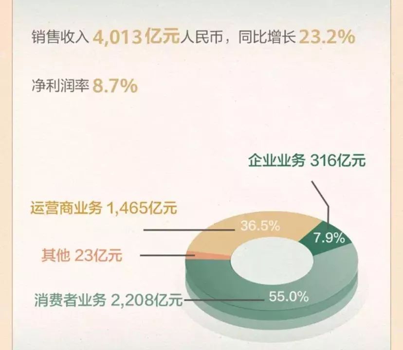 数据显示,今年上半年华为公司销售收入4013亿元,同比增长23.2%,净利润率为8.7%。其中,消费者业务实现销售收入2208亿元,占比55%;运营商业务1465亿元,占比为36.5%,企业业务为316亿元,占比为7.9%。