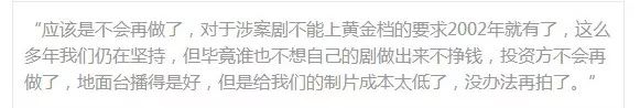 # e7 c* ^' y, o+ d) J“谁也不想自己的剧做出来不挣钱,投资方不会再做了,地面台播得是好,但是给我们的制片成本太低了,没办法再拍了。” 5 t7 E' H: K" Z* y