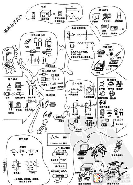 # M7 a9 e+ N- e, [# y下图提供了一个很好的出发点,告诉我们那些是要学的,要按照怎样的顺序学。这张图提供了用来设计使用电子设备的基本元件的概况,并且给出了应该怎样学习的信息。, h( {+ [7 ?! E: |( c
