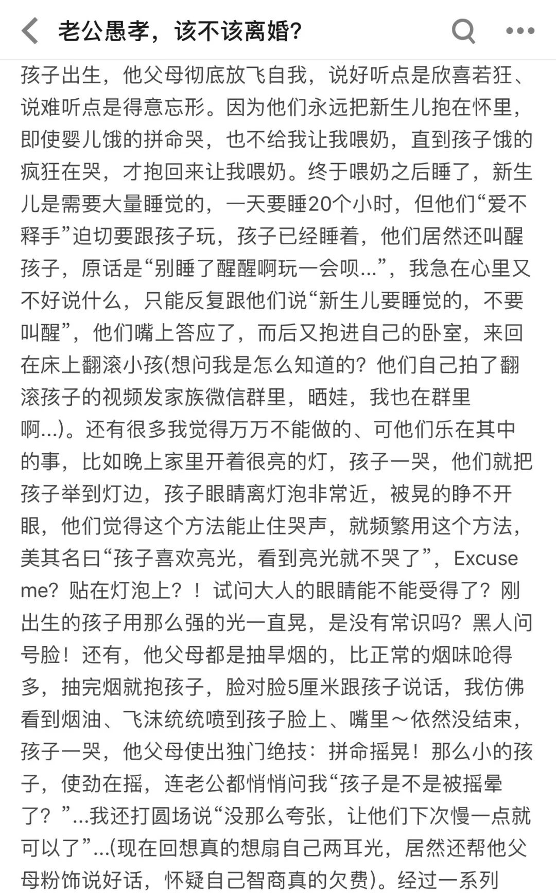 7 v7 K; ^! \6 u最近知乎上有一篇热帖《老公愚孝,该不该离婚》。内容很多,我简单概述下:北京姑娘,上市公司董事长秘书,年薪20万,老公是东北小伙,凭着苦学改变命运的农村苦孩子,年薪60万。爱情始于一穷二白,恋爱6年后买房结婚。婚后为了备孕,姑娘辞掉工作。怀孕后都是自己照顾自己,直到孕晚期公婆名义上来照顾,实际上是她给公婆做了一个月的饭,公婆对她很满意。问题爆发在孩子出生后。公婆各种稀罕,各种逗、玩、抱,睡觉弄醒、用力摇晃,最终导致孩子住院。 n$ M! ?$ f) s/ C$ o; i, O