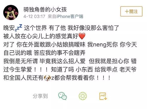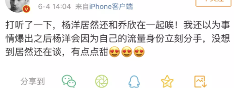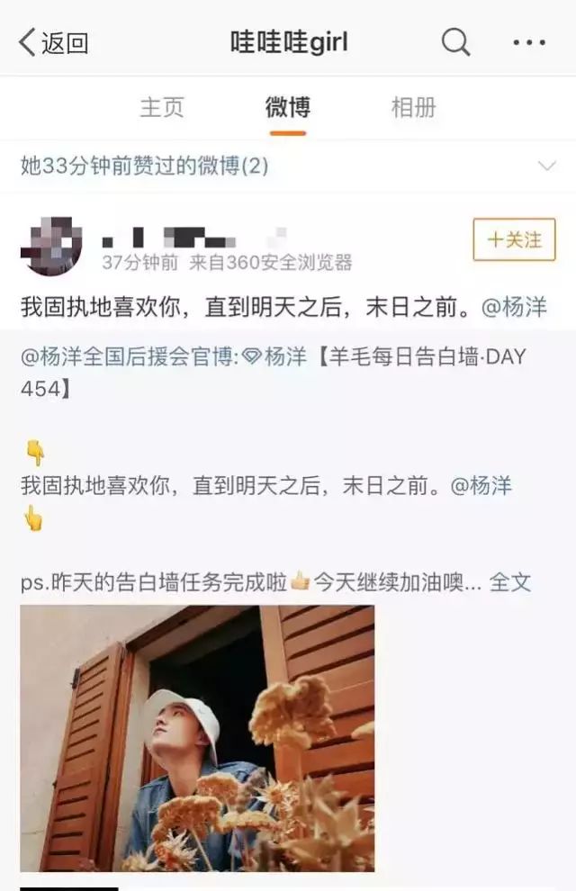 : x+ m2 F6 [# h与此同时,又有放大镜网友发现了疑似乔欣的小号,还点赞了一条告白杨洋的微博,5 ~1 o" K: P$ `! A