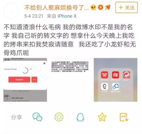 1 @$ \" C3 {5 ?直到一个小时之后,在粉丝的提醒下,这个小号取关了这个微博。. j7 K' `+ K+ H4 t
