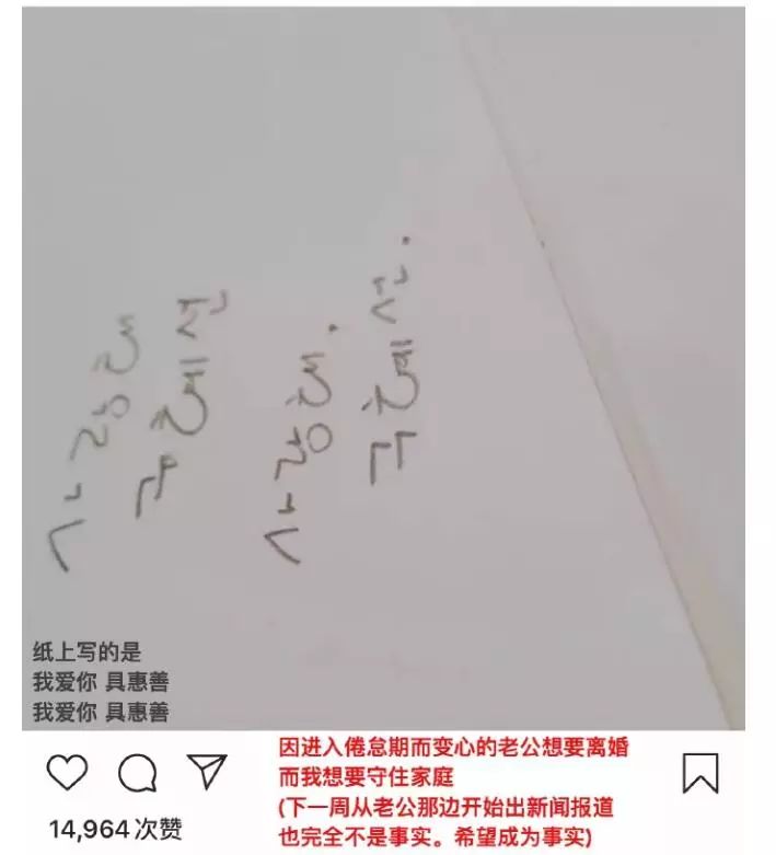 " s% a( e. J& j" z, H手写条款是作家具惠善很喜欢的一件事。所以在婚姻期间,她和安宰贤各自起草了一份夫妻准则,还签字保证。