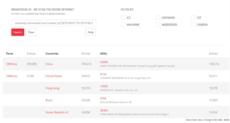 1 V& b- I2 c/ E据报道,将近100万台计算机存在BlueKeep高危漏洞风险,且根据BinaryEdge扫描发现仍有70万台中国计算机处在风险之中。" U. b/ ^2 L A0 {% I8 a- p