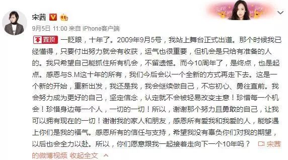 6 G* y) v/ V0 L2019年9月5日,宋茜与SM娱乐公司合约到期,双方不再续约,但正在探讨其他的合作可能性。