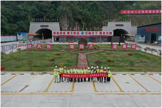 . g0 J% Y1 C3 m& k“当代中国奇迹之旅——贵黄高速龙昌隧道”媒体团员与项目部领导合影。摄/赵汗青8 F, F2 n( M% o5 I& c3 J5 L: H