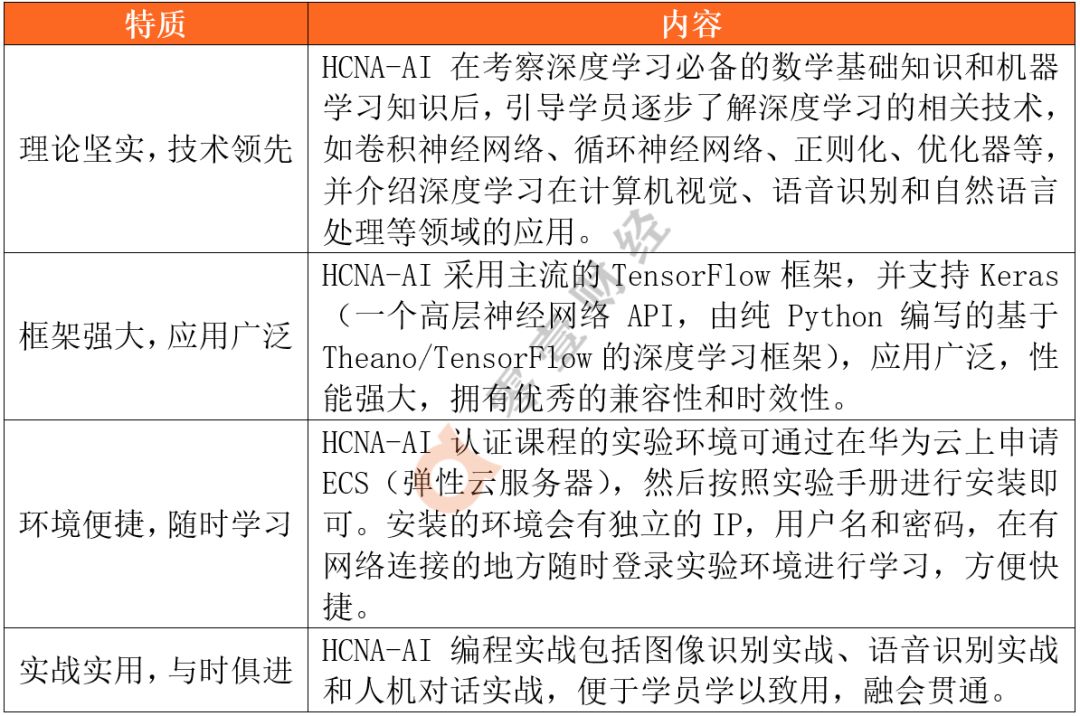2018年7月,华为发布人工智能工程师认证(HCNA-AI),旨在培养具有人工智能基础理论知识,并能应用业界通用人工智能框架进行应用开发、创新的专业人才。该认证拥有以下四大特质。8 N9 H( G8 i; c1 Y6 ], d; W