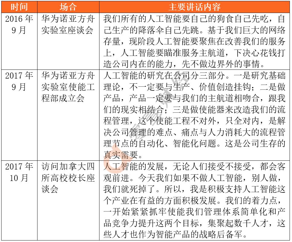 0 _; }. c2 S/ ?( T表1 任正非关于AI的部分讲话