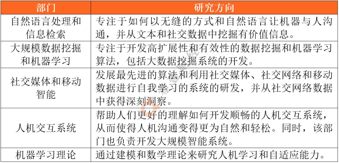 / S+ G3 k: ]0 r6 S3 x华为的研究成果离不开其强大的研究所——“2012实验室”。实验室名字取自电影《2012》,目前旗下有16家研究所/实验室,8家位于国内,8家位于国外。其中,“诺亚方舟实验室”是华为的人工智能研究中心,位于香港、深圳、北京、上海、西安、伦敦、巴黎、多伦多、蒙特利尔等地。该实验室主要部门和研究方向如下表所示。& R1 h1 m2 ~9 D& g5 @2 W8 C5 ^