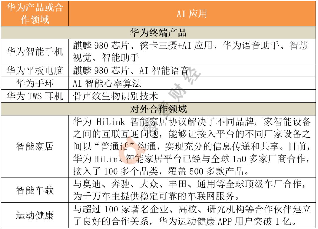 目前,华为的AI能力主要应用于自身的智能终端产品(手机、平板电脑、手环等),以及合作伙伴的终端产品。
