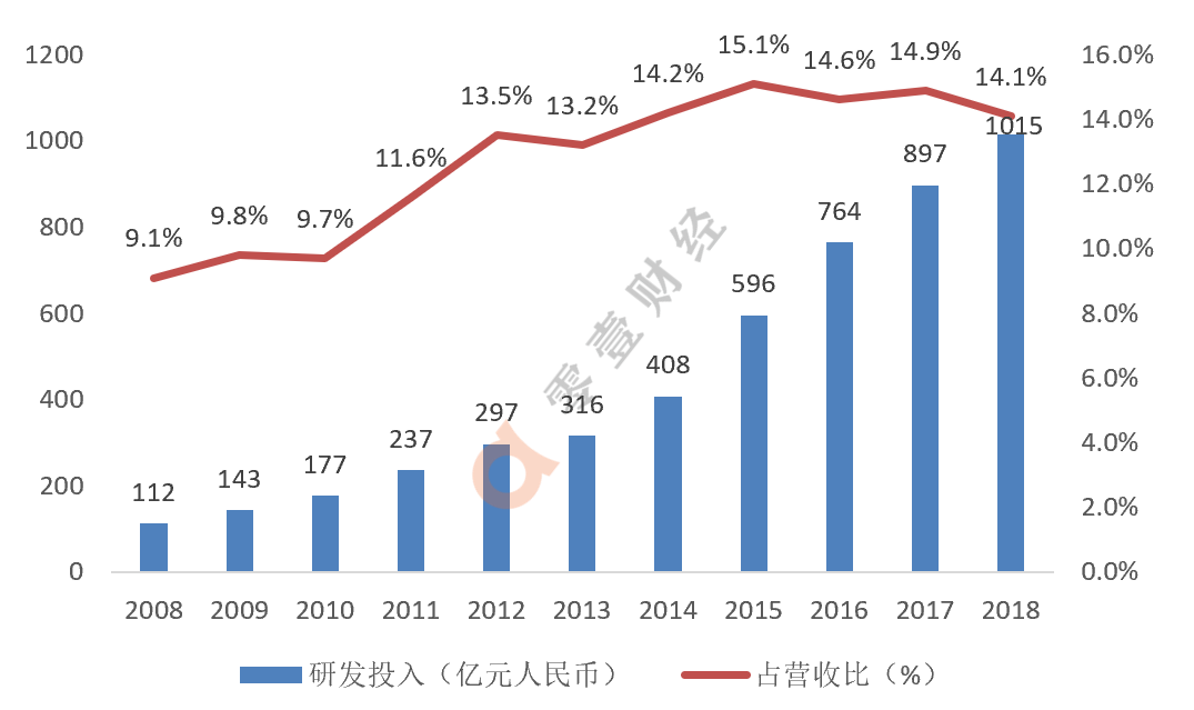 ( D5 H9 H; b$ {' G: d- F图1 华为近11年研发投入