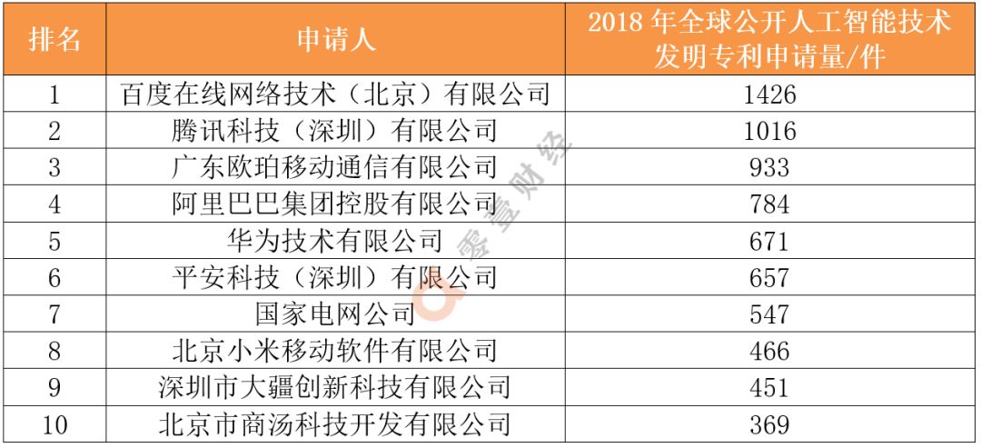 表2 2018年中国企业AI技术发明专利排行榜(前10) 1 N2 \, ?, w; ~3 E8 c. a, [