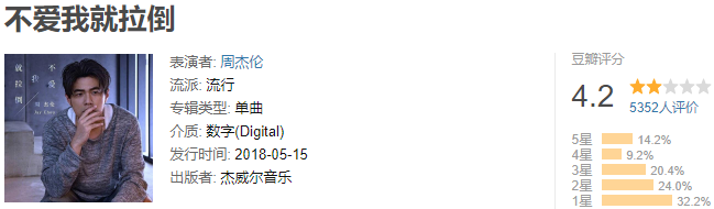 u: u, e0 N7 [( R0 m. S豆瓣评分5.8,比去年那首令老粉暴走的《不爱我就拉倒》高了1.6分。