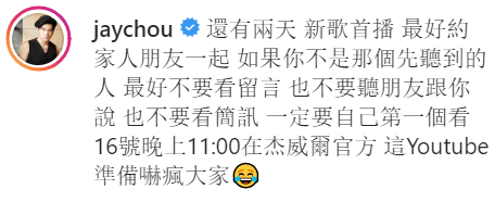 还有两天,新歌首播,最好约家人朋友一起, 如果你不是那个先听到的人,最好不要看留言,也不要听朋友跟你说,也不要看简讯,一定要自己第一个看。准备吓疯大家。" {3 P9 A/ h# c! d) E% @) x