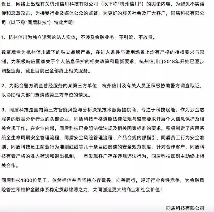 9 月 27 日,同盾科技又来了一封声明,专门对“数聚魔盒”进行说明。