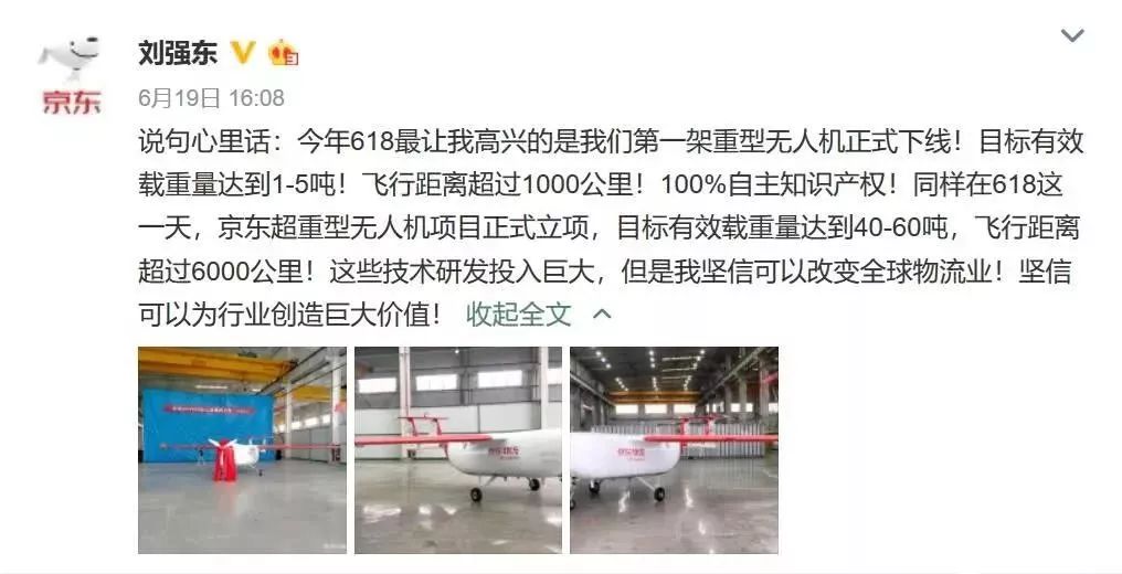 在京东618促销创造1600亿元新高之后,刘强东却宣布:今年618最让他高兴的,是京东第一架重型无人机正式下线。