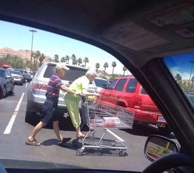 7 y6 L. F- ~: ^& J* Z老奶奶虽然笑着打趣老伴儿说,你还推得动吗,却腿脚麻利地跳到了购物车上,老爷爷就一脸宠溺地推着她往前走。 0 b* i4 A* ^. O/ I( @