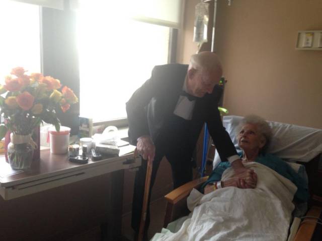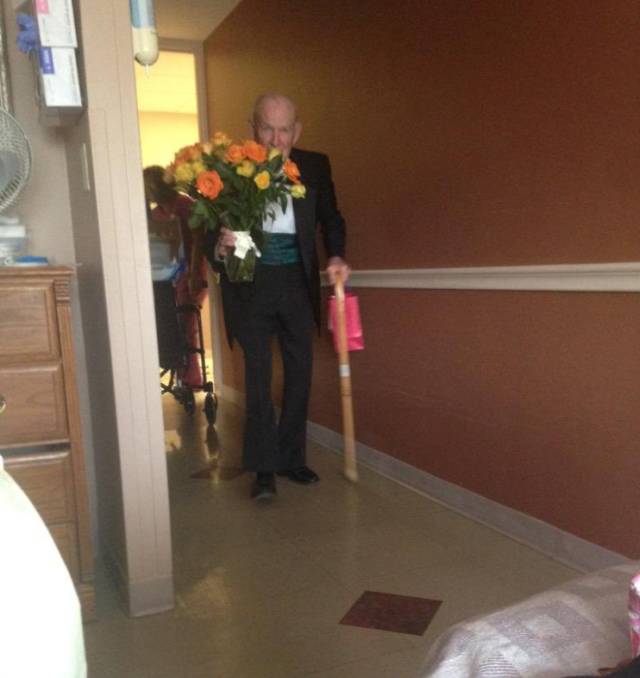 ! ^ Y+ Q' \9 e老奶奶不久前住院了,结婚57周年这天,老爷爷突然出现在医院,一手拄着拐杖,一手拿着奶奶最爱的鲜花,给了她一个巨大的惊喜。 " r1 d& T; H$ X# |) G3 N