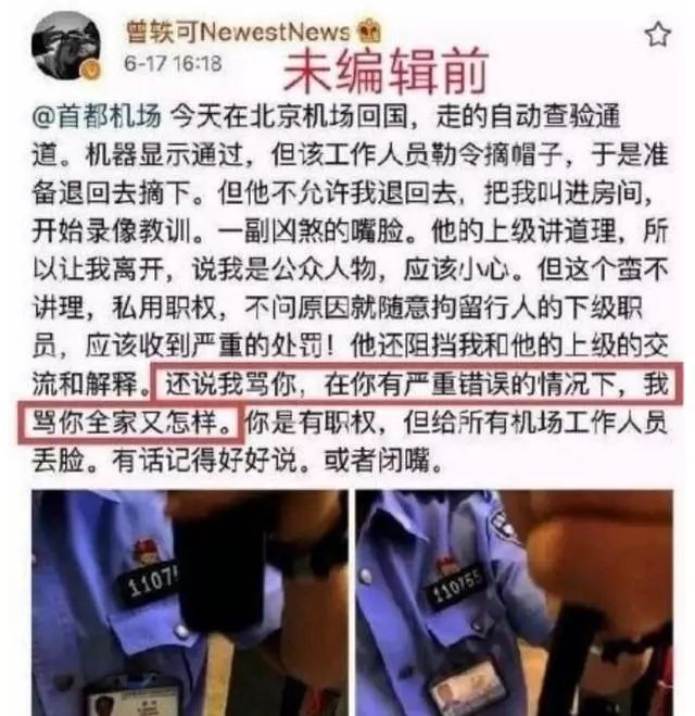 % I% R# C" ~2 I$ x% ]然而就在事情闹得沸沸扬扬的时候,北京边检发文解释了经过,原因竟是曾轶可耍大牌在先,并且辱骂工作人员。