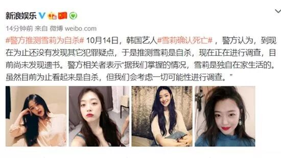 v$ N0 J" T7 G" ?$ `: G @简而言之,雪莉的死亡显然是在一瞬间想到的,而警方既然通报是自杀身亡,那么也可以排除掉他杀的嫌疑,但尽管如此,我们可以发现雪莉是通过上吊这一方式自杀的。上吊自杀这种方式虽然可行,但实际上已经很少有相关例子,而上一次有类似消息的时候,也同样出自韩国娱乐圈,2009年,轰动韩国娱乐圈的张紫妍案,主人公张紫妍就是在家中上吊自杀,而直到现在过去了10年,张紫妍案仍未落下帷幕。6 W) C( l5 J( M' |# ^