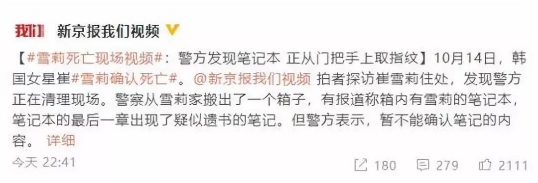 ) f/ R" N5 k+ e6 o1 @10月15日,雪莉疑似留下遗书登上热搜,昨天崔雪莉自杀死亡的消息震惊娱乐圈,不少网友为她感到难过,10月14日,韩国女星崔雪莉确认死亡。新京报记者探访崔雪莉住处,发现警方正在清理现场。警察从雪莉家搬出了一个箱子,有报道称箱内有雪莉的笔记本,笔记本的最后一章出现了疑似遗书的笔记。但警方表示,暂不能确认笔记的内容。