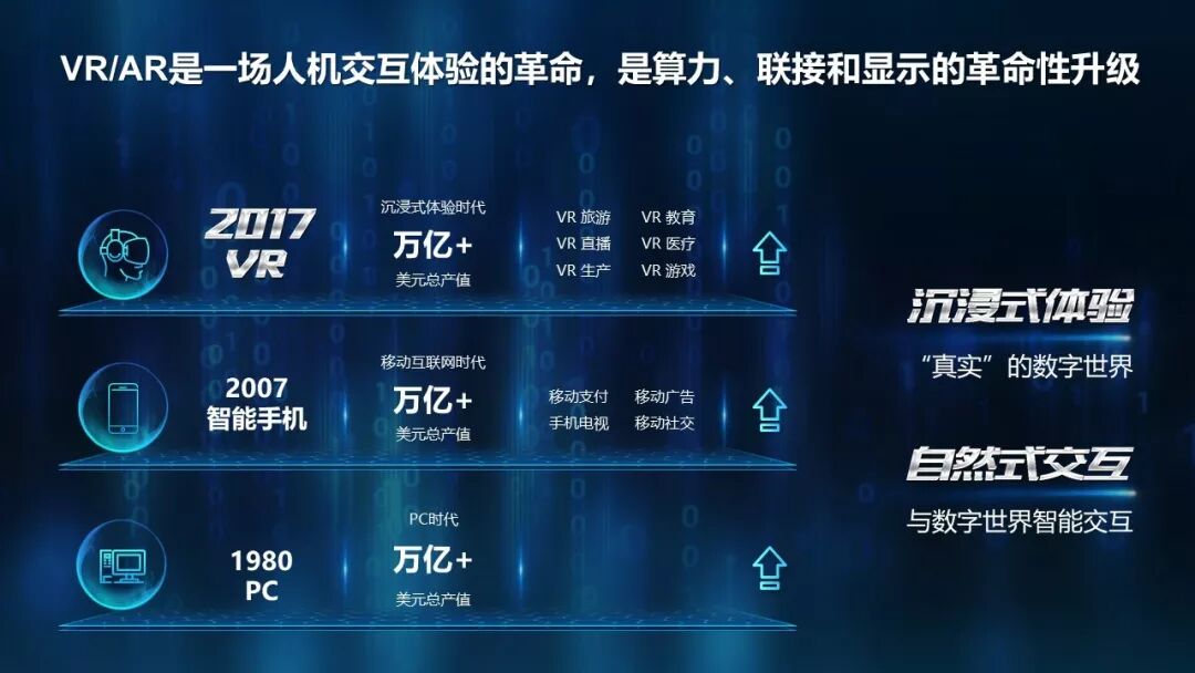 郭平还介绍了华为的定位:打造好VR/AR的高速公路,从终端引擎,管道,到云端计算,支撑整体产业的繁荣。