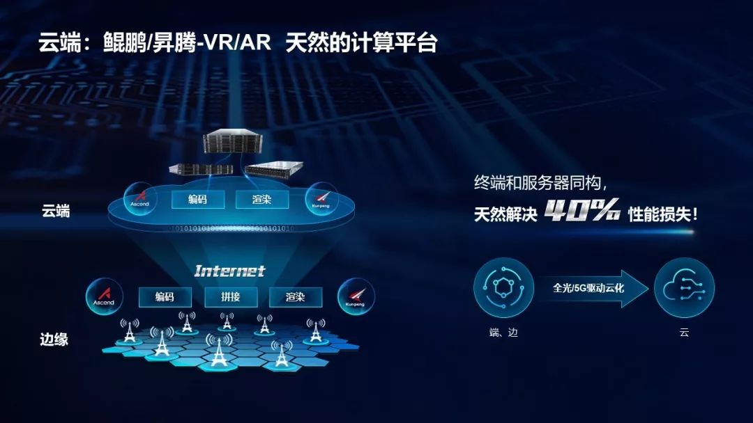云端计算方面,华为推出的基于Arm架构的鲲鹏/昇腾计算平台,能够避免VR软件向云端移植带来的40%的性能损失,成为众多VR/AR应用端边云协同计算的有力支撑。