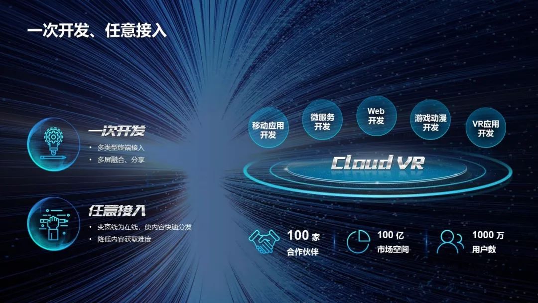 在华为,我们以Cloud VR的方式为开发者提供“一次开发、任意接入”的机会。以往程序员需要为分散的各种硬件平台开发多个版本,适配困难。华为正在打造通用的内容开发API,解决开发痛点、运营痛点,让应用适配更多的用户。